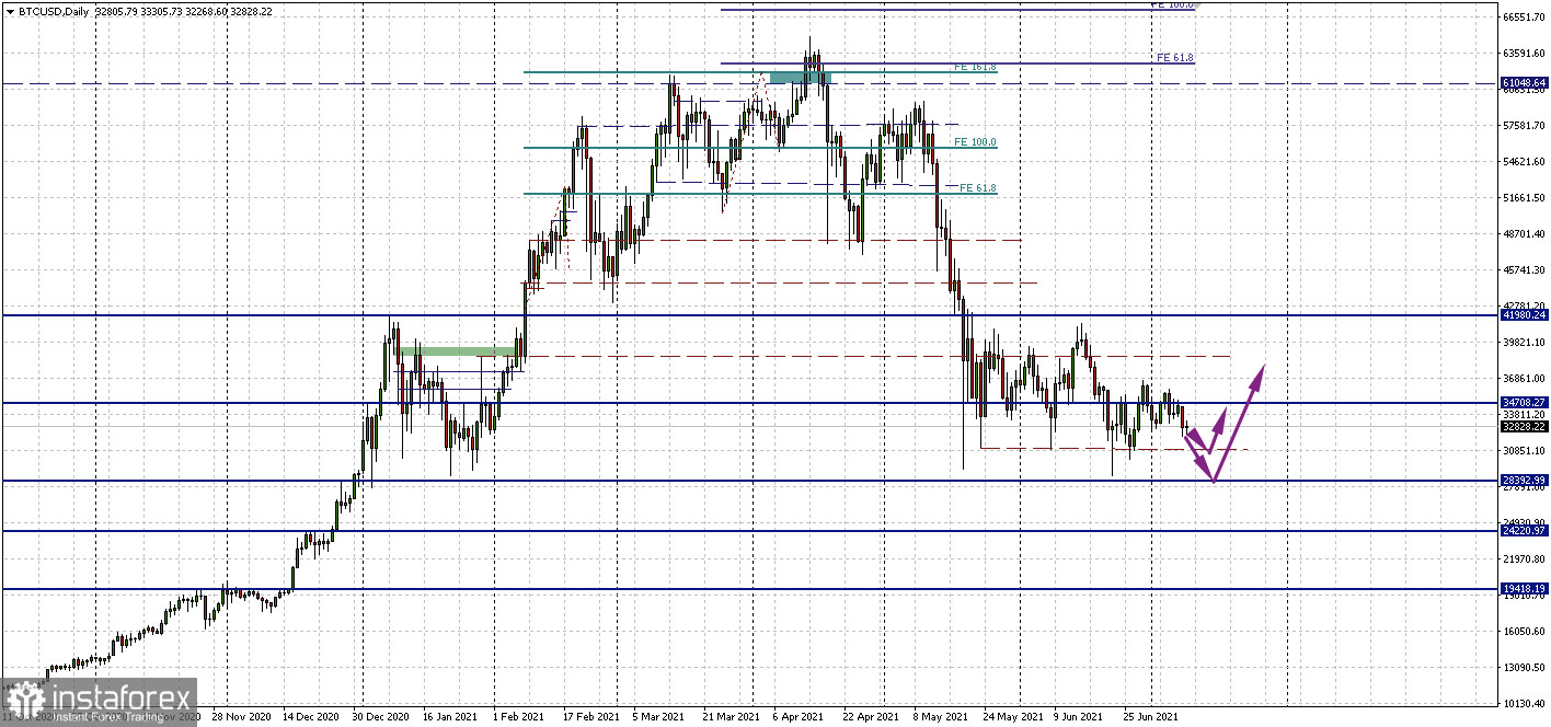The situation has returned to the uncertainty zone. The center of attraction that holds back further development is now the area that combines the daily Ichimoku cross and the monthly medium-term trend (34354.58). These levels' influence still does not allow us to have a clear leader in the market and make far-reaching plans. An attempt to change the situation with the further appearance of bullish prospects may be a rise to the following resistances 35498-36079 (daily Fibo Kijun + lower limit of the daily cloud) and 37884 - 38958 (weekly and monthly short-term trends). As for the bears, the breakdown of the nearest important border, namely the supports of the minimum extremes (29701.91 – 29151.97), will allow them to make new plans.